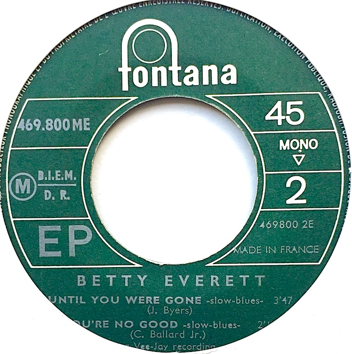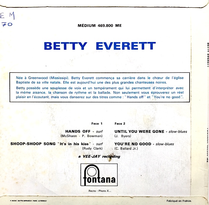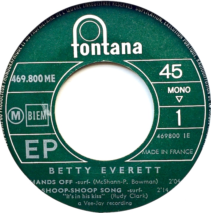 4 original mono recordings on this nice French EP. The Shoop-Shoop Song “It’s In His Kiss” was originally intended for, and rejected by The Shirelles. Betty Everett reached number 1 on the R&B charts in 1964 and the record has been covered by dozens of other artists over the years. Most notably perhaps by Cher who also topped the charts in 1990.