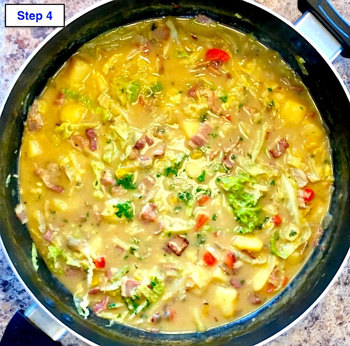 - Add the cream (or crème fraîche) and cabbage and cook for another 5 minutes. Check the seasoning and adjust to taste
