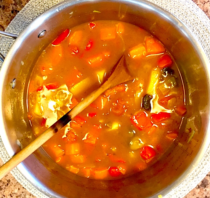 Add the 2 crushed garlic cloves and stir for 1 min before adding the 1 litre of vegetable stock. Simmer for 5-10 mins until the onions are very soft, then set aside.